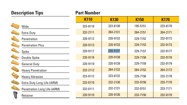 Engineered for maximum performance in the most demanding mining and quarrying applications, the 220-9137 K130 Tooth is the ultimate replacement ground engaging tool (GET) for your Caterpillar front shovel. This heavy-duty tooth is specifically designed to excel in abrasive and high-impact conditions, delivering superior breakout force, extended service life, and a lower cost per ton.