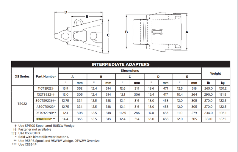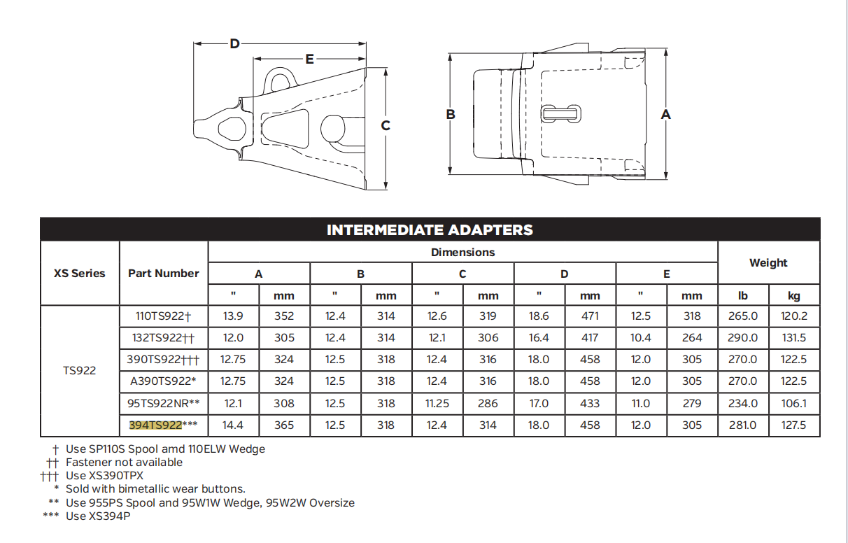 394TS922 Tooth Adapter - Part of TS922 Tooth System for Excavators