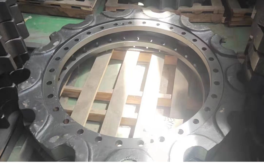This sprocket is a critical drivetrain component for the Hitachi EX1200-6 mining excavator, designed to engage with the track bushings and provide propulsion.