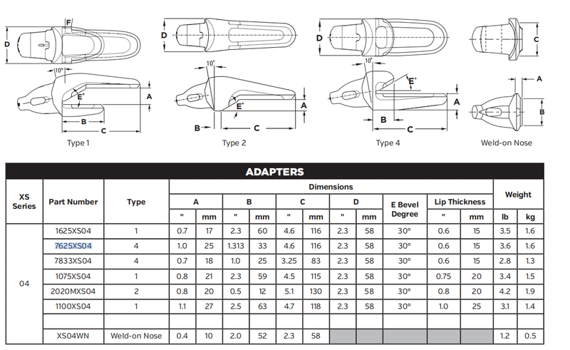 Bucket Adapter 7625XS04 for XS04 Series Bucket Teeth - Compatible with Excavator and Loader